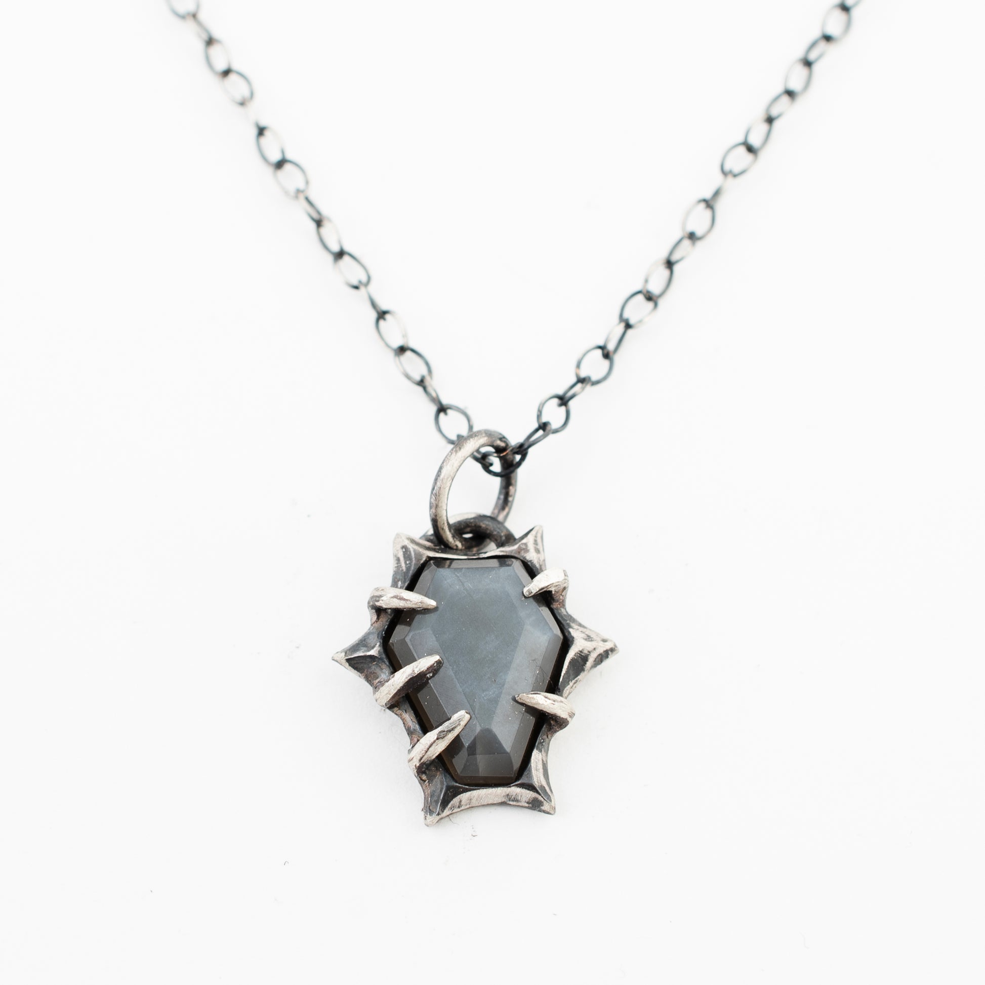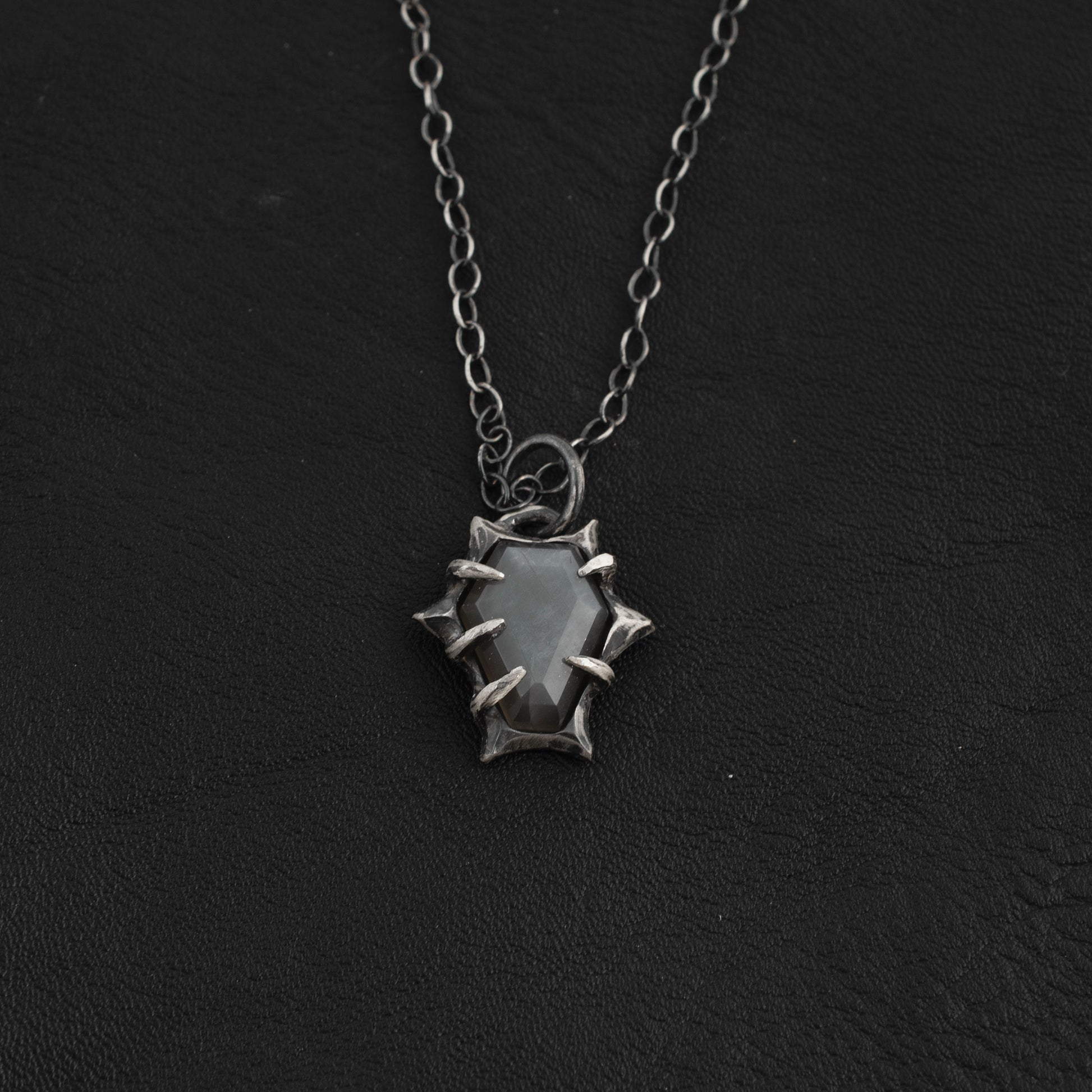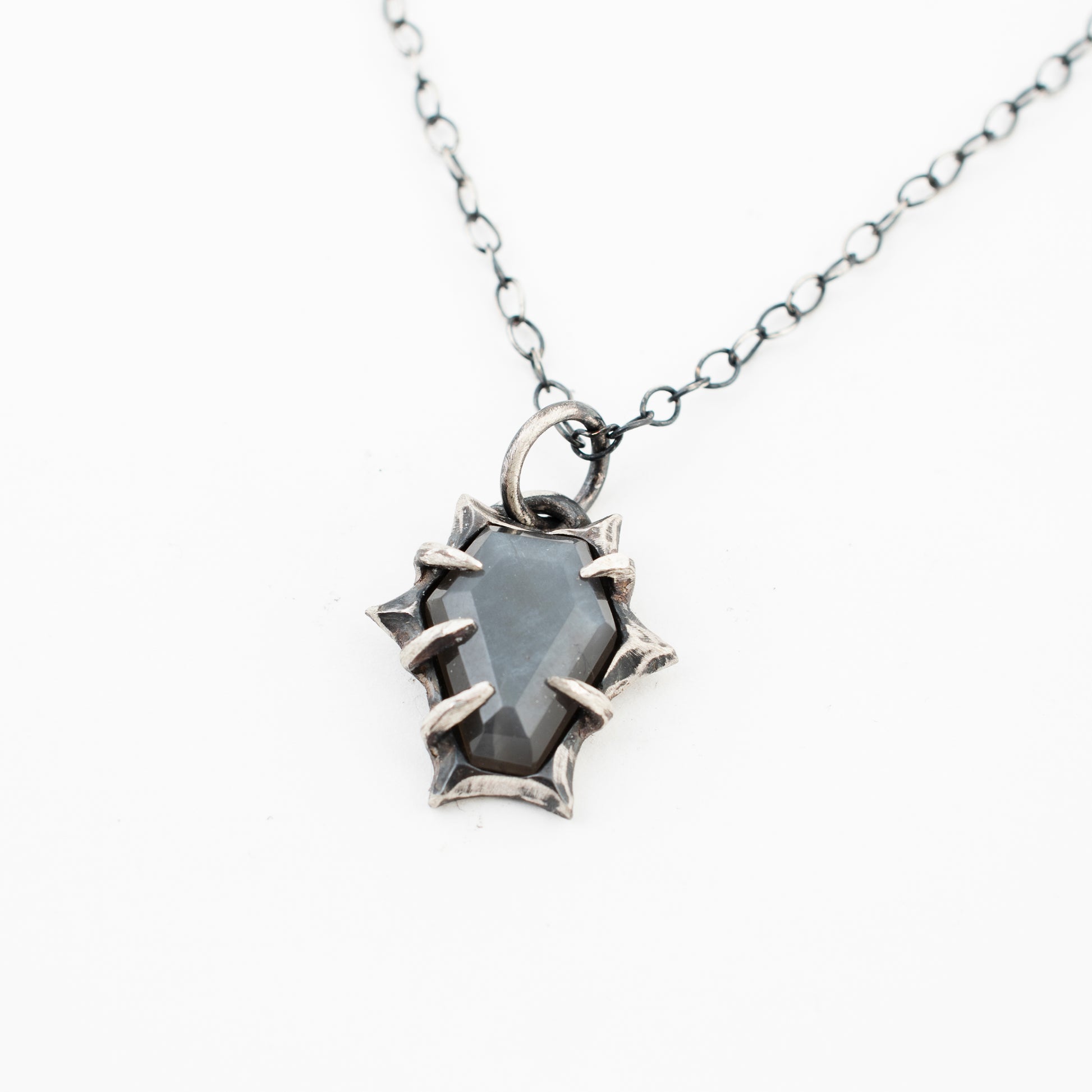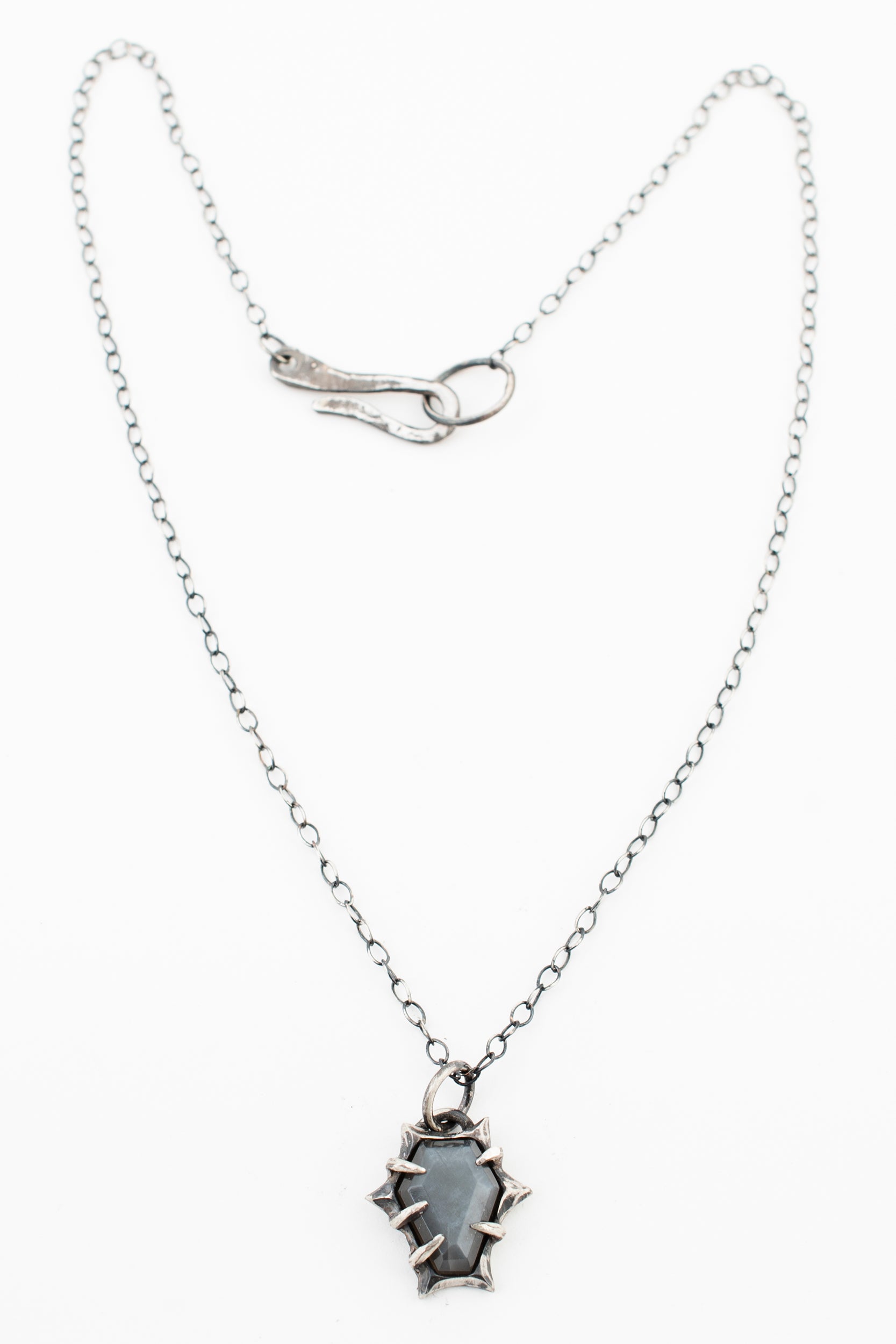 A luminous round faceted sapphire, shimmering with soft twilight tones, rests within a handcrafted sterling silver setting. Delicate yet fierce, the spiked prongs give the piece an edge, while the petite scale and fine chain keep it effortlessly wearable. The oxidized silver accentuates the stone’s natural brilliance, making this necklace a perfect blend of understated elegance and rugged, organic design.